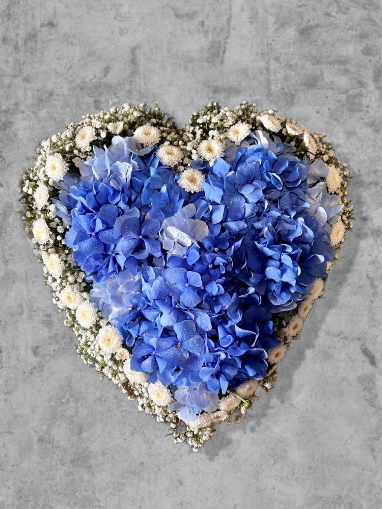 Our blue heart funeral wreath from Celine's Flowers is crafted with care, symbolizing peace, serenity, and enduring love. While the primary design features a calming blue, our expert florists are adept at incorporating various hues to reflect the personality and preferences of the deceased or their family. For a gentleman, deeper blues, whites, and perhaps subtle greens could be integrated, while for a lady, softer blues, creams, or even touches of pink or lavender can create a gentle and respectful display. The heart shape itself conveys deep affection and remembrance, making it a particularly touching choice for a funeral service or memorial.