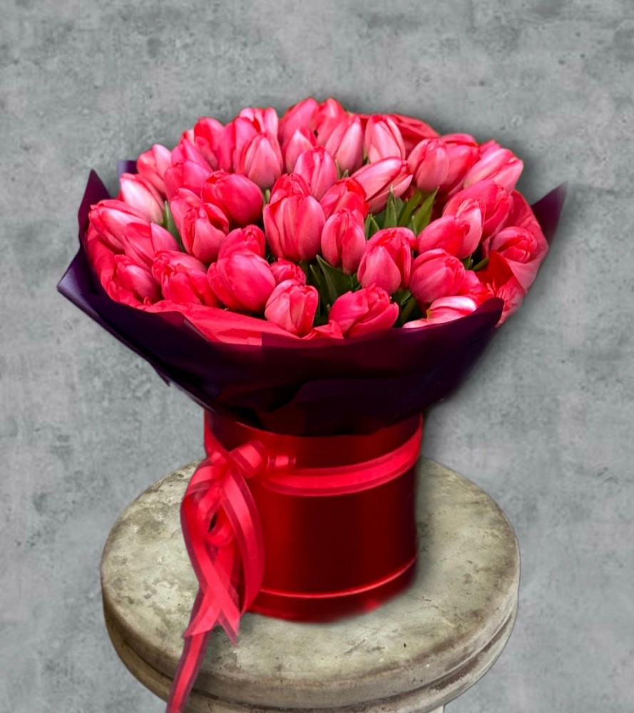 The core of the Blushing Devotion arrangement is the Tulip, a genus of spring-blooming perennial herbaceous bulbiferous geophytes. By utilizing fifty stems, the arrangement achieves a dense, architectural volume that emphasizes the tulip's unique "lily-flowered" or "cup-shaped" morphology. Pink tulips, specifically, are celebrated in horticultural literature for their soft, satiny texture and the way their petals react to light—a phenomenon known as photonasty, where the blooms open in the light and close in the dark.